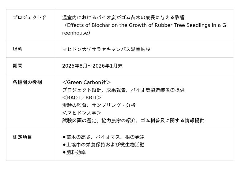 ネイチャーベースのカーボンクレジット創出・販売事業を展開するGreen Carbon株式会社(代表取締役:大北潤、以下Green Carbon(グリーンカーボン))は、マヒドン大学およびタイゴム研究所(正式名称:Rubber Research Institute of Thailand、以下RRIT)を含む、タイ王国天然ゴム公社 (正式名称:Rubber Authority of Thailand、以下RAOT)と協力し、バイオ炭がゴムの苗木の初期成長に与える影響を評価するため、タイ初の管理型温室実験(以下本実験)を正式に開始しました。