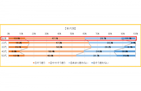 年代別にみると、20代(63.2%)・30代(65.1%)はともに「思う」が6割超だが、40代(59.2%)、50代(53.3%)は徐々に減少していく傾向が見られた。