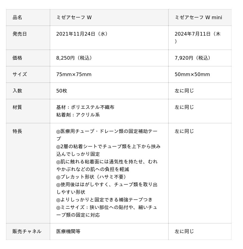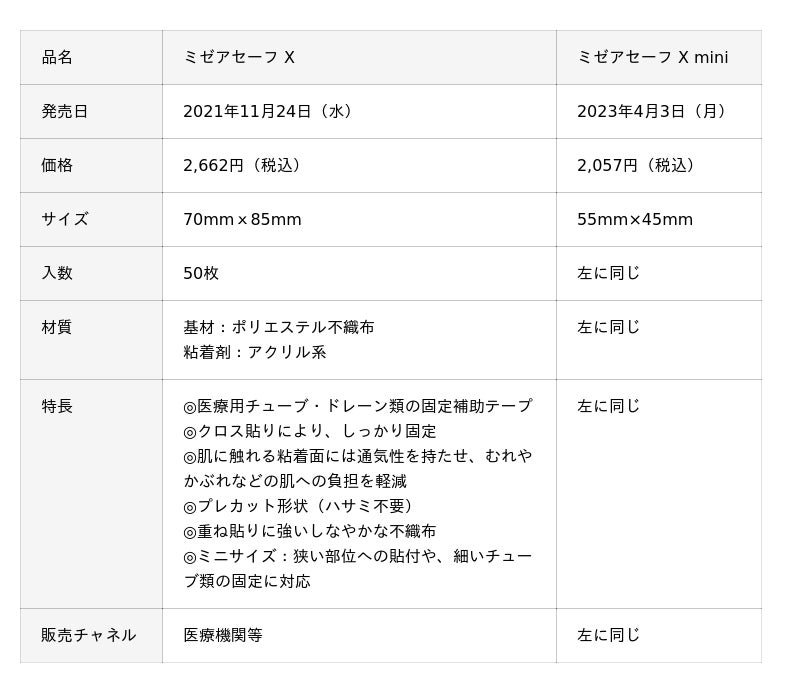 『ミゼアセーフ』は、医療現場で使用されるチューブやドレーンが体動などで外れる「抜去」のリスク軽減を目指した固定用テープです。昨今、高齢者の増加とともに、せん妄、認知症により患者自らチューブ類を抜いてしまう「自己抜去」が多くみられ、治療への支障や再装着が医療機関、患者双方の負担をもたらしています。『ミゼアセーフ』は、テープの形状を工夫し、従来のサージカルテープと比較して固定力をアップさせることにより「抜去」リスクを軽減させています。また、患者の肌の負担を和らげる通気性を確保した独自のウェーブ塗工※と、医療従事者の工数軽減に貢献するハサミ不要のプレカット仕様を採用しています。ラインアップは、2枚のシートがチューブを上下から挟み込む形状で、多種多様なチューブ類をしっかり固定する『ミゼアセーフW 』と、クロスする形状で引っ張りにも強い『ミゼアセーフX 』の2種類。さらに『ミゼアセーフX 』『ミゼアセーフW 』それぞれに狭い部位にも貼りやすく、細いチューブ類の固定時にも扱いやすいミニサイズを発売しています。