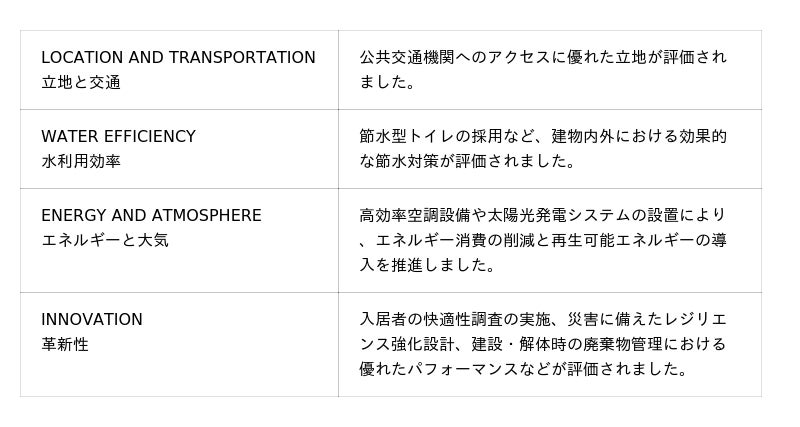 LEEDは、米国グリーンビルディング協会が開発・運用する敷地を含めた建物が、人や環境に考慮しているかを評価する国際的な認証システムです。ユアサ商事が認証を受けたのはLEED V4 BD+C New Construction New Constructionで、新築の建物が対象となります。特に以下の項目で高い評価を得ました。