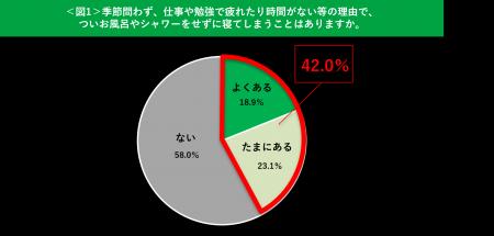 ・ 季節問わず、仕事や勉強で疲れたり時間がないときに、ついお風呂やシャワーをせずに寝てしまうことがある方は約4割。