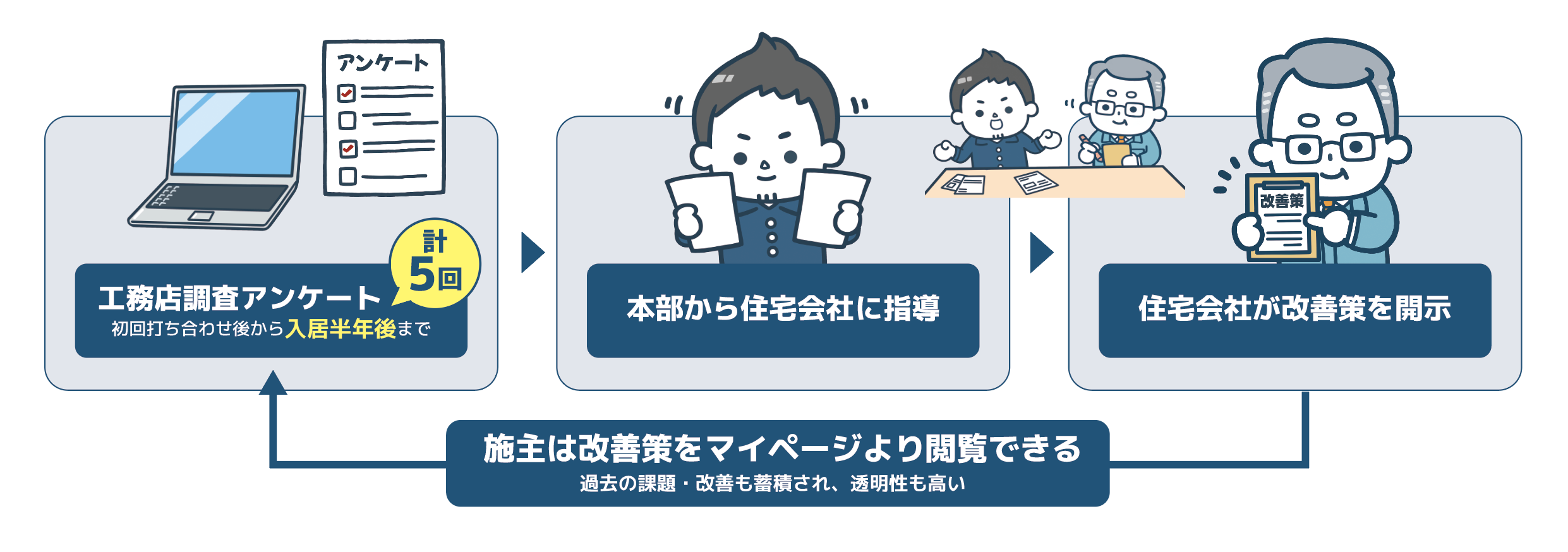 さらに、アンケート内容は本部がすべて確認し、住宅会社へ直接改善を指示。この透明で健全なサイクルが、施主を孤立させず、プロジェクト全体の質を高め続けます。