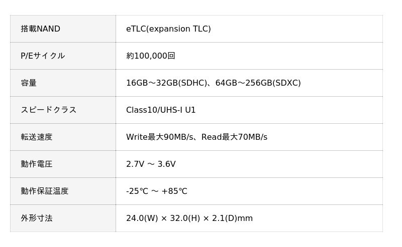 TLCベースでありながらSLCと同等レベルのデータ保持信頼性を実現し、さらにP/Eサイクルを大幅に向上したeTLC(expansion TLC)タイプの「産業用SD」と「産業用microSD」です。
