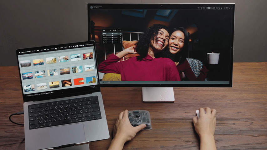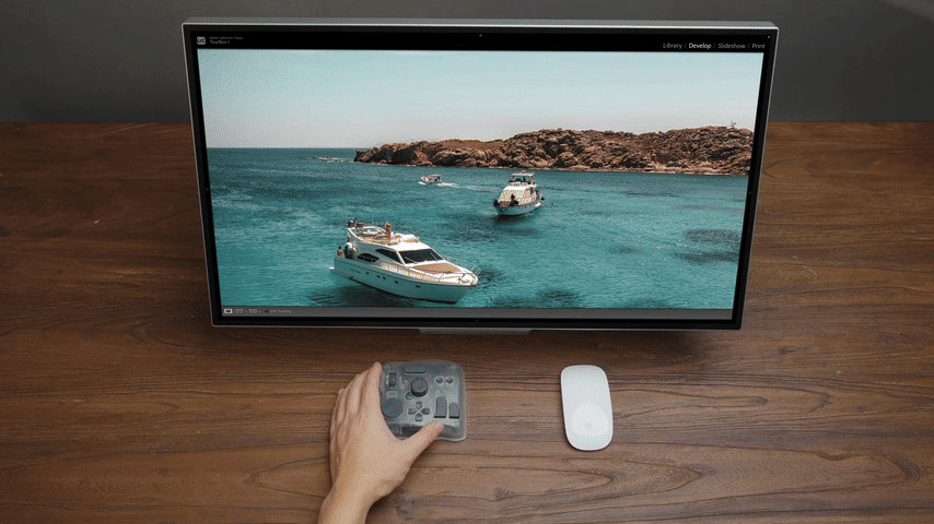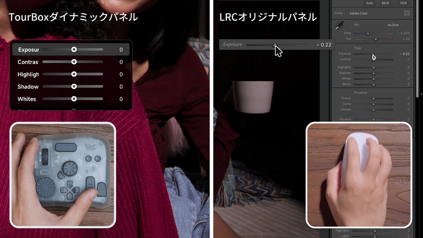 この状況に対し、TourBoxが新たにリリースした「ダイナミックパネル」は、新しい解決策を提案します。操作をオリジナルパネルから切り離し、写真の調整と色調補正を別のエリアに分離します。必要なときに、必要な場所で、手の届く範囲で操作できるようにすることで、Lightroom Classicをフルスクリーン表示のまま色調補正を完了できる環境を実現しました。