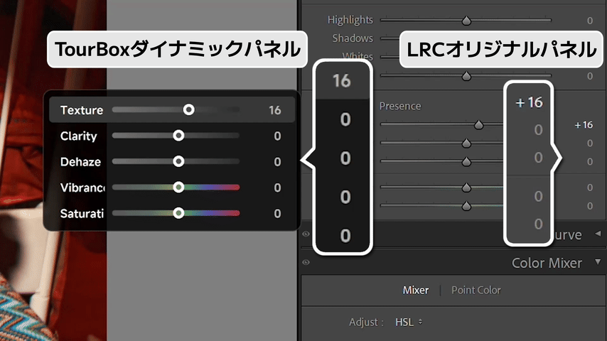 ダイナミックパネルで露光量を3/4の位置に移動すると、LrCの方のスライダーも同時に同じ位置に移動されます。数値と視覚は完全移籍、LrCでの数値を100%再現します。インターフェースの違いからもたらすミスや不安感を解消できます。