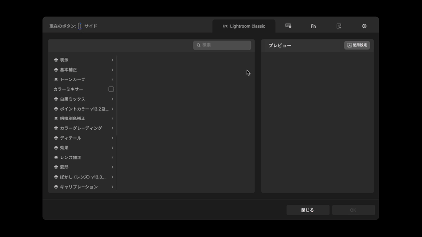インストール:TourBoxの新ユーザーは最新版TourBox Consoleをダウンロード、インストールすれば、ダイナミックパネルを使用できます。既にTourBoxを使っているユーザーは最新版TourBox Consoleをアップデートした後、新規プリセット作成から【Lightroom Classic】を選択すれば、デフォルトプリセットから新機能を使用できます。
