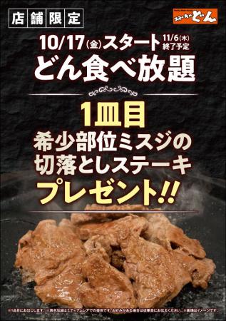 【ステーキのどん】10月17日(金)より”4店舗限定企画”として、『どん食べ放題』ご注文のお客様に、希少部位ミスジの切落しステーキを1皿プレゼント!!