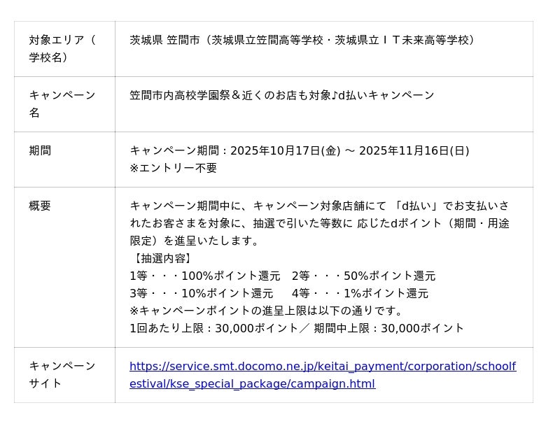 株式会社NTTドコモ(以下、ドコモ)は、学園祭×周辺エリアにおいておトクな「d払い(R)」キャンペーンを開催いたします。詳細は、下表のとおりです。
