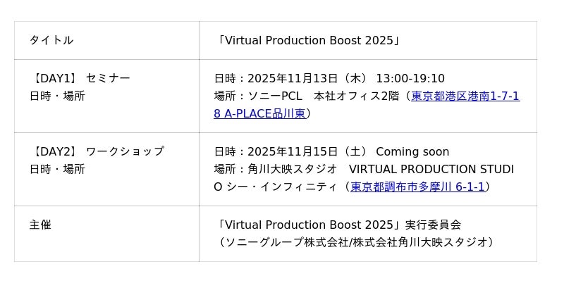 LEDを活用したバーチャルプロダクション(以下、VP)は、いまや映像制作の現場で広く活用されており、もはや一部の先進企業だけのものではありません。この動きをさらに加速させるため「Virtual Production Boost 2025」を開催します。本イベントは、ソニーグループとKADOKAWAの資本業務提携後の新たな協業活動のスタートとして、業界の知見を共有し、新たな連携や創造の機会を生み出すことを目的としています。
