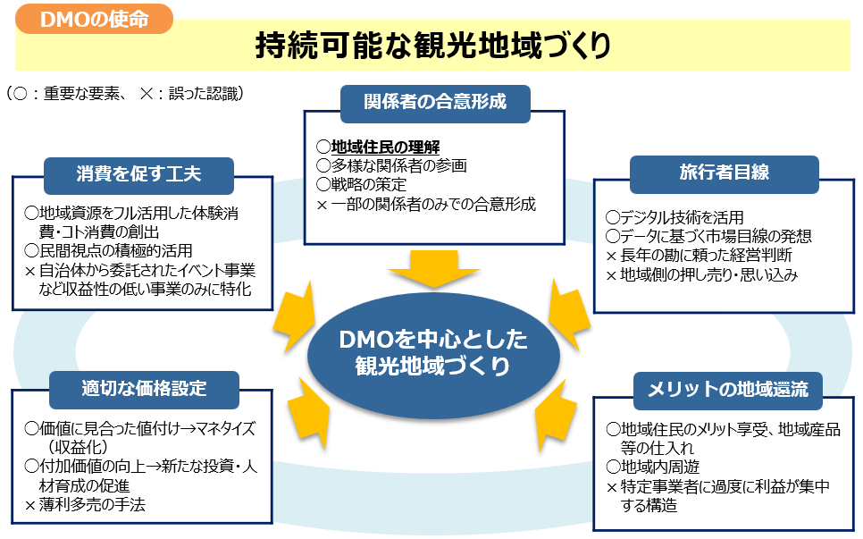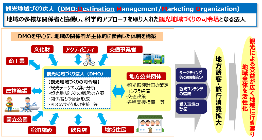 観光地域づくり法人(以下「DMO」という。)は、地域の「稼ぐ力」を引き出すとともに、地域への誇りと愛着を醸成する地域経営の視点に立った観光地域づくりの司令塔として、多様な関係者と協働しながら、明確なコンセプトに基づいた観光地域づくりを実現するための戦略を策定し、着実に遂行する機能を備えた法人です。