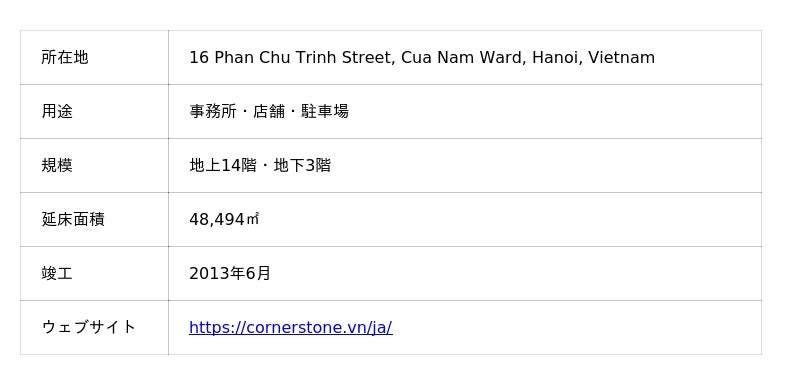 ダイビル株式会社(社長:丸山卓、本社:大阪市北区、以下「当社」)がグループ会社のDaibiru CSB Co., Ltd.を通じベトナム・ハノイ市に保有・運営する「コーナーストーン・ビルディング」に関し、LEED Operations & Maintenance」*1のPlatinum認証を取得しましたのでお知らせいたします。