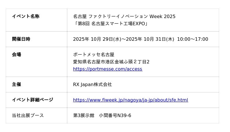 「名古屋 ファクトリーイノベーション Week 2025」内の「第8回 名古屋スマート工場EXPO」に出展します。