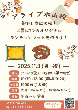 株式会社アライブ(愛知県名古屋市、代表取締役:三井博美)が運営するアライブイングリッシュスクール本山校では、2025年11月3日(祝・月)に、幼稚園の年長生~小学6年生を対象とした「英語で楽しむ Art Work イベント2025」を開催いたします。