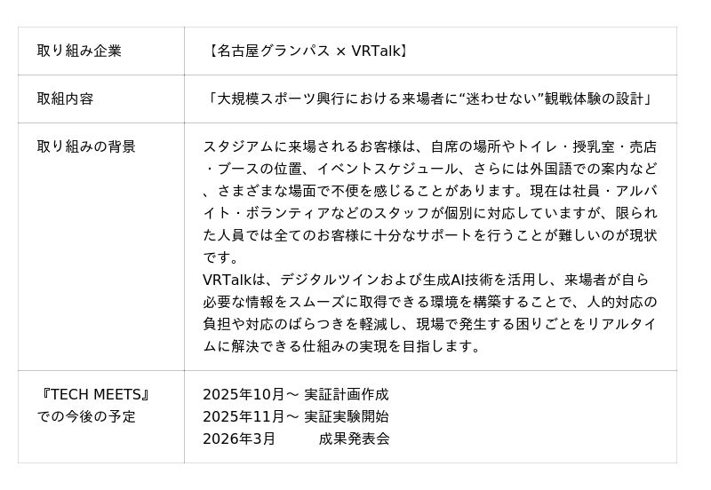 この取り組みは、日本最大級のオープンイノベーションプラットフォーム「AUBA」を運営する株式会社eiicon(エイコン)が、愛知県とともに実施する、あいちデジタルアイランドプロジェクト『TECH MEETS(テック ミーツ)』において、名古屋グランパス様がニーズ企業(自社の課題解決や付加価値の創出を目指す企業)となり、VRTalkがシーズ企業(提示したテーマに対して、先端デジタル技術を提供する企業)としてマッチングされ、実現したものです。