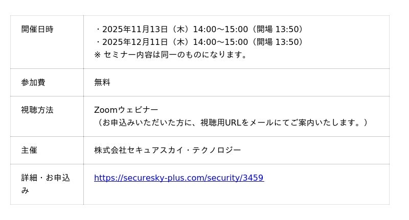 安全なWebサイトを実現するために脆弱性診断とクラウド型WAFを提供する株式会社セキュアスカイ・テクノロジー(本社:東京都千代田区、代表取締役:大木 元、以下:セキュアスカイ)は、WAFの導入を検討している方やDDoS攻撃への対策を検討している方向けに、「クラウド型WAF+DDoS対策解説 オンラインセミナー ~Webアプリの脆弱性攻撃とDDoS攻撃から企業を守る~」と題したセミナーを2025年11月13日(木)と12月11日(木)に開催します。