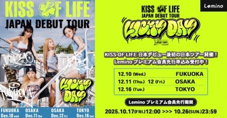 株式会社NTTドコモ(以下、ドコモ)が運営する映像配信サービス「Lemino(R)」の月額990円(税込)※1「Leminoプレミアム」において、「KISS OF LIFE Japan Debut Tour [Lucky Day]」のLeminoプレミアム会員先行チケット販売を2025年10月17日(金)正午より開始いたしました。
