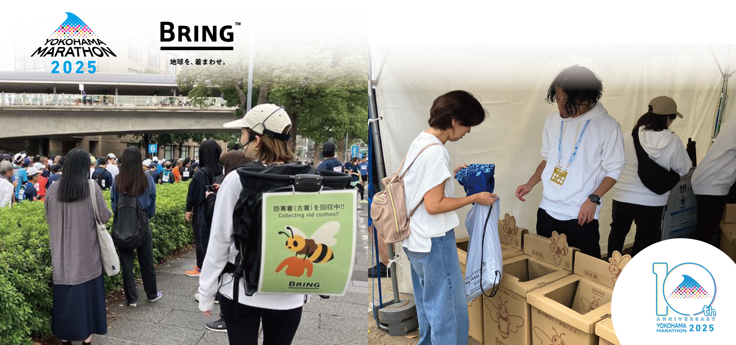 今年はJEPLAN、横浜マラソン、NPO法人HpRunの協働により、回収チームを編成してスタート地点での防寒着の回収を実施します。また、フィニッシュとなる臨港パークで開催される横浜マラソンフェスタでは、当社ブースにて不要になったスポーツウェアをはじめとした衣類を回収する取り組みも実施します。回収された防寒着をはじめとした衣類は、BRINGのプラットフォームを通じてリユース・リサイクルされることで、廃棄物削減と資源循環の両立を図ります。
