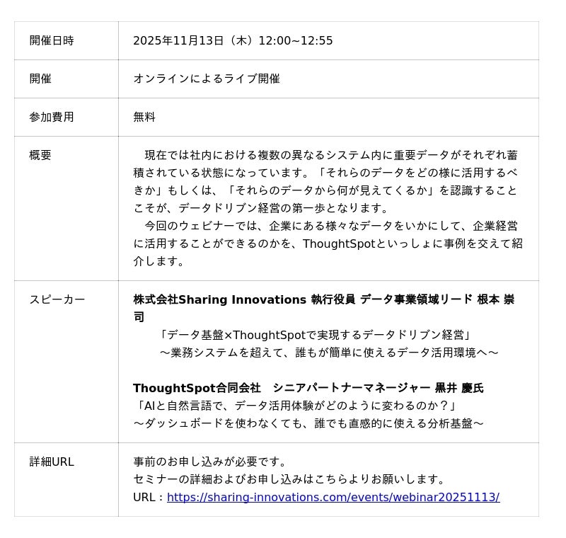 企業の経営基盤を支えるDXパートナーである株式会社Sharing Innovations(本社:東京都渋谷区、代表取締役社長:信田 人、以下シェアリングイノベーションズ、親会社:株式会社Orchestra Holdings)は、11月13日(木)、ThoughtSpot合同会社(東京本社:東京都千代田区)を招いて、「AI時代の、企業に眠るデータを活かすデータ基盤最前線!」と題してオンラインセミナーを開催します。