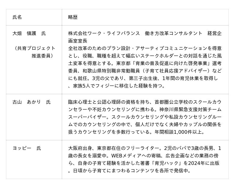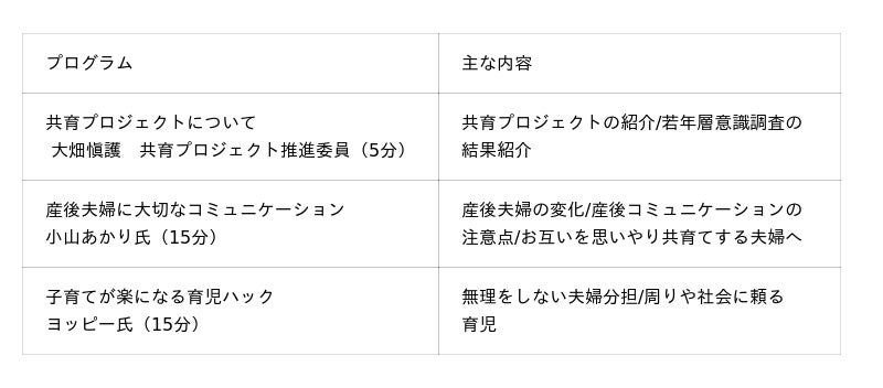 また、10月25日(土)12時40分から、「共に育てるための夫婦の会話術」をテーマにセミナーを実施します。本セミナーには、共育プロジェクトの推進委員をはじめ、臨床心理士と公認心理師の資格を持ち、首都圏公立学校のスクールカウンセラーや不妊カウンセリングに携わる古山あかり氏、フリーライターのヨッピー氏を招き、それぞれの視点から講演を行います。いずれも、入場、聴講は無料です。