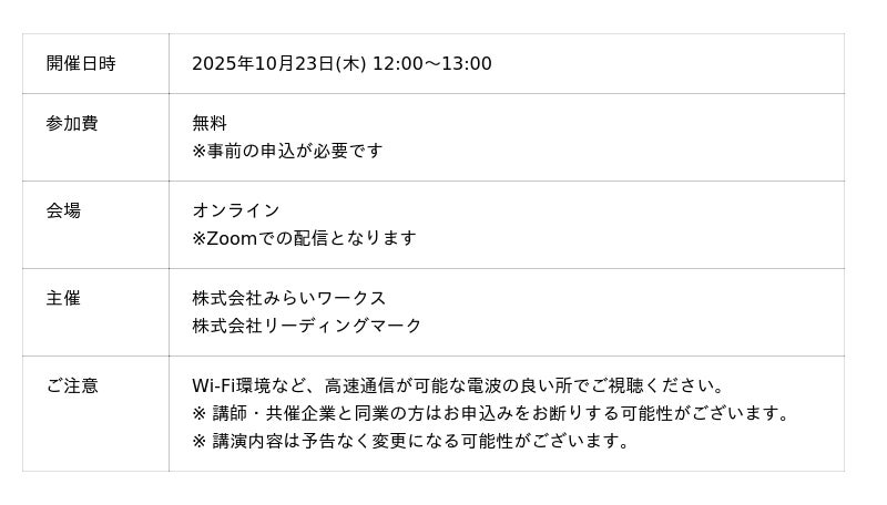 即戦力となるプロフェッショナル人材のマッチングサービス『フリーコンサルタント.jp』を展開する株式会社みらいワークス(本社:東京都港区、代表取締役社長 岡本 祥治、以下「当社」)は、2025年10月23日(木)に、株式会社リーディングマークと共催でオンラインセミナーを開催します。