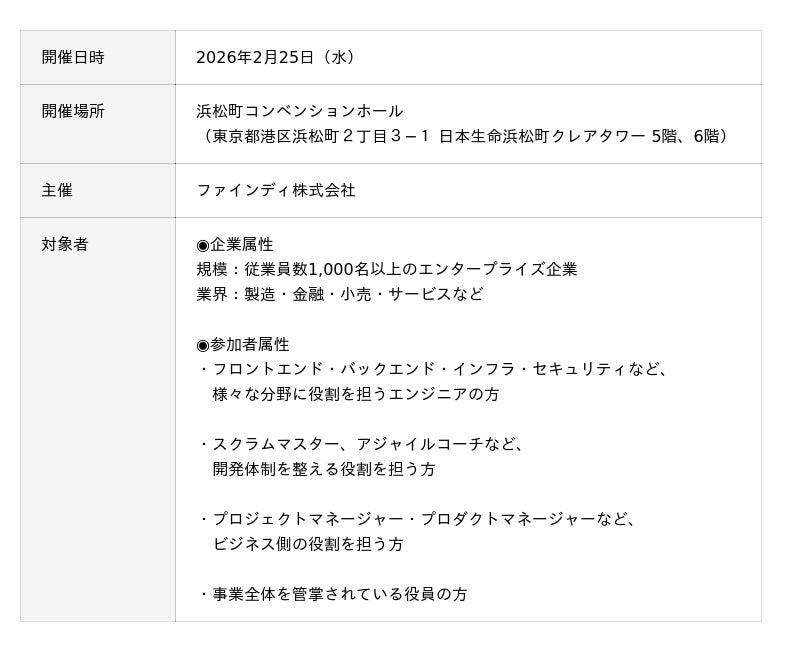 エンジニアプラットフォームを提供するファインディ株式会社(東京都品川区、代表取締役:山田 裕一朗、以下「当社」)は、内製開発に特化したカンファレンス「内製開発Summit 2026」のスポンサー募集を開始したことを発表します。本サミットは、大手企業における内製開発の最新事例を共有する場として、2026年2月25日(水)、浜松町コンベンションホールにてオフライン開催いたします。なお、スポンサー申し込みの一次締切は、2025年10月31日(金)を予定しております。