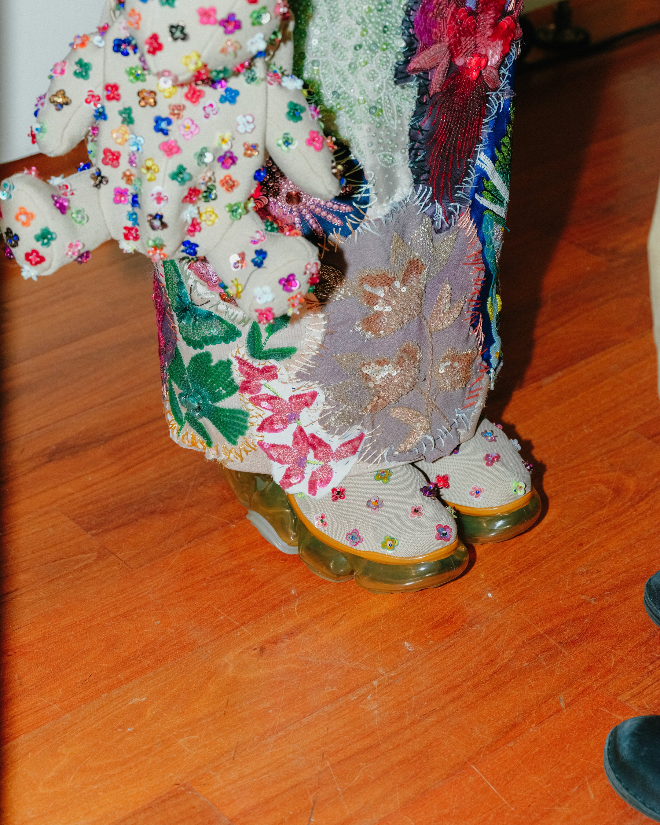 また、細かく縫い込まれたスパンコールで装飾されたニットアッパーのブーツは、職人技へのこだわりをさらに際立たせています。一つ一つのディテールには当時の記憶が重なっており、制作を振り返ったデザイナーはこう語ります。