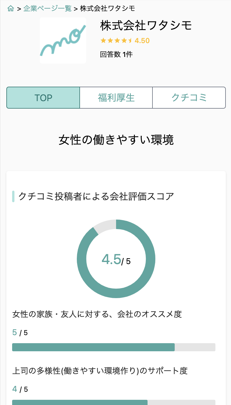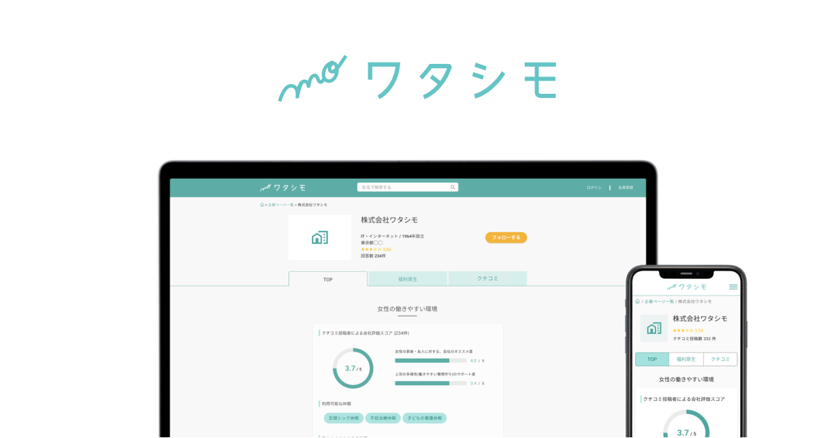 2022年3月、女性視点での働きやすさがわかる職場のクチコミ投稿プラットフォーム『ワタシモ』をリリースしました。職場で働く女性のリアルな声が聞けるプラットフォームとして、β版リリース時点で、100件以上のクチコミが集まっています(2022年3月時点)。 株式会社ワタシモは、「『あたりまえ』が存在しない、誰にとっても生きやすい社会」の実現をビジョンとして、2021年11月に設立しました。企業詳細はウェブサイト(