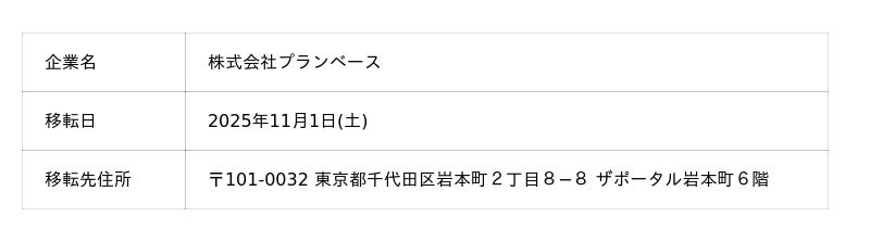 株式会社プランベースは、2025年11月1日(土)に 東京都千代田区岩本町2丁目8−8 ザポータル岩本町6階 への移転を行います。