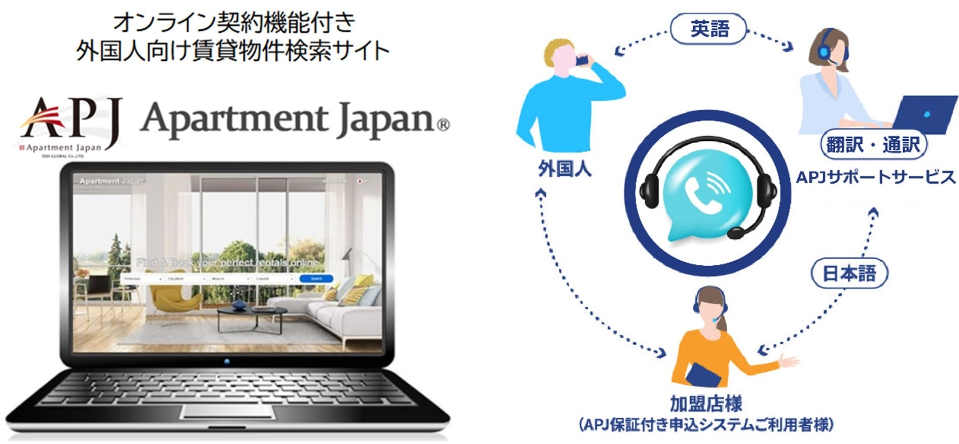 Renxa株式会社(東京都豊島区 代表取締役:坂本幸司、以下「当社」)は、DID-GLOBAL株式会社(本社:大阪市中央区、代表取締役:近藤 暁子、以下「DID-GLOBAL」)と業務提携し、これまで業界でも例の少なかった来日前対応型検索・申込・契約機能を統合する外国人専用賃貸DXプラットフォーム「Apartment Japan(R)(アパートメントジャパン、以下「APJ」)」において、外国人入居希望者を英語で支援する「通訳機能付きコールセンターサービス APJサポートサービス(以下「APJサポートサービス」)」を開始いたしました。