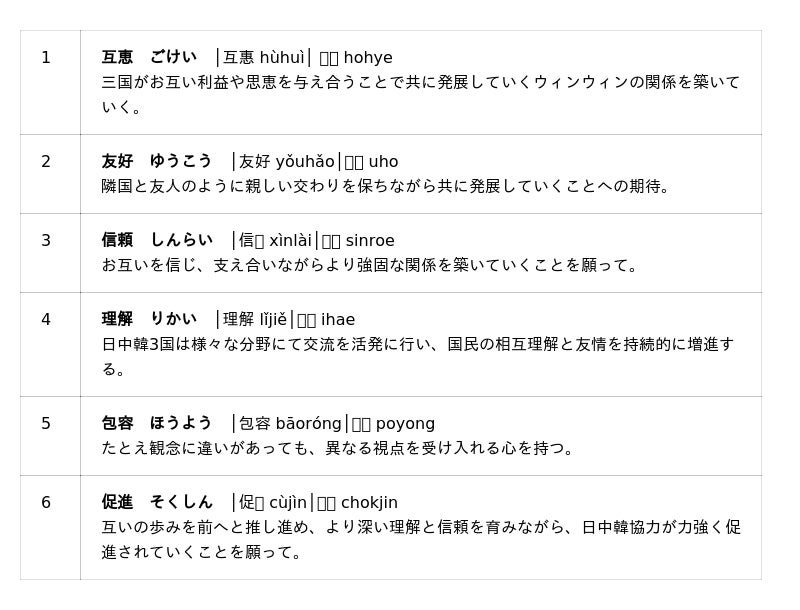 【「日中韓協力を象徴する2026年の単語」6候補】