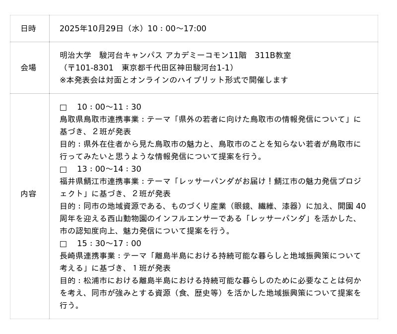 明治大学地域連携推進センターは、10月29日(水)明治大学駿河台キャンパスで、2025年度学生派遣プログラム(鳥取県鳥取市、福井県鯖江市、長崎県)成果発表会を開催いたします。