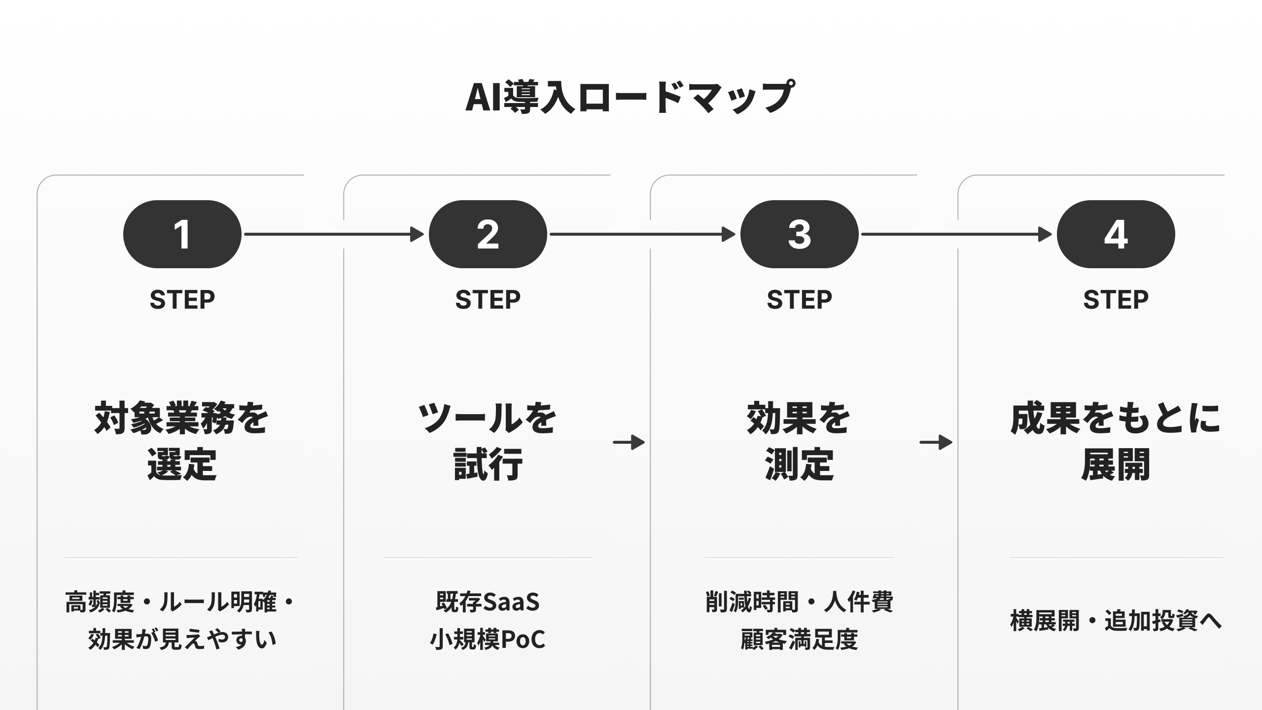 最後に、AI導入を成功させるための具体的な「AI導入ロードマップ」を紹介しました。