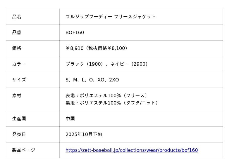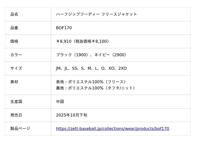 「ベースボールを科学する。」ゼット株式会社(本社/大阪市天王寺区、代表取締役社長/渡辺裕之)は、野球アウターウエアで人気のフリースジャケット、2タイプ(フルジップタイプ・ハーフジップタイプ)を発売いたしました。