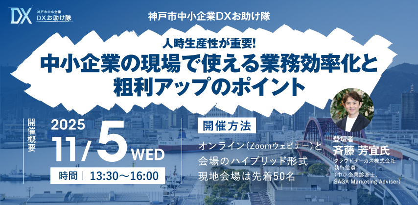 神戸市中小企業DXセミナー参加者募集開始「中小企業の現場で使える業務効率化と粗利アップのポイント」