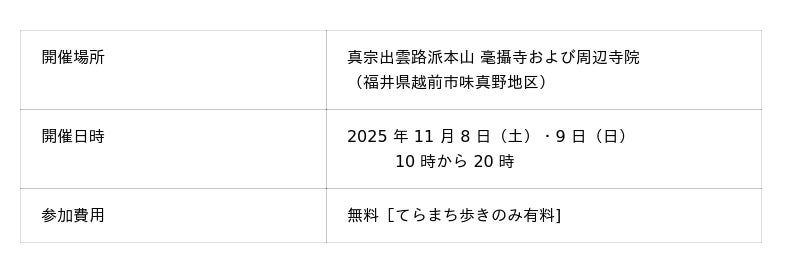 2025 年 11月 8日(土)、9日(日)の2日間、福井県越前市味真野地区一帯を会場に、イベント『味真野 お寺びらき』を開催いたします。ぜひ事前取材や当日の取材をお願いいたします。