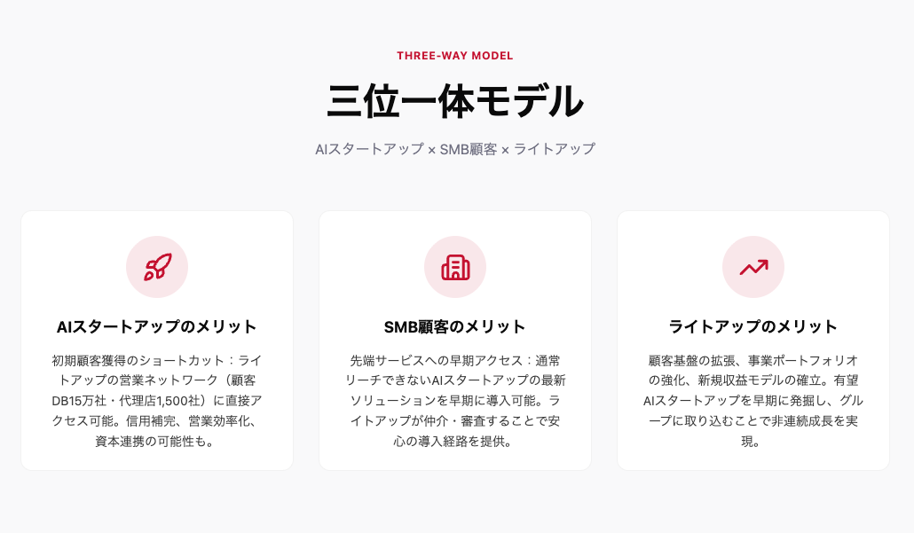 本サービスは、AIスタートアップ × SMB(中小企業) × ライトアップの三位一体モデルを採用し、全国15万社の企業ネットワークと1,500社の代理店ネットワークを活用し、AIスタートアップの営業支援を実施します。