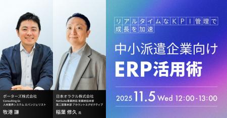 リアルタイムなKPI管理で成長を加速 中小企業向けERP活用」と題した無料セミナーを2025年11月5日(水)12:00~オンラインで開催いたします。