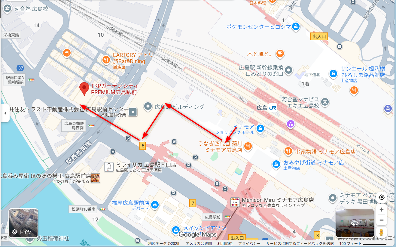 JR線 広島駅 南口 徒歩2分JRでお越しの方は、ミナモア改札を出て→ペデストリアンデッキを通り→西隣の広島JPビルディング→地上に下りて、TKPまでお越しいただくとスムーズです。