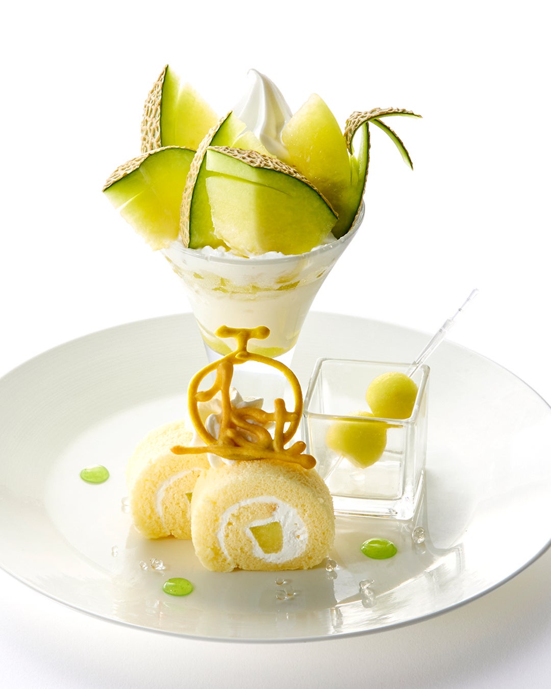パフェとロールケーキが一緒に楽しめる、限定プレートです。どちらもシンプルな仕立ての中で、マスクメロンの芳醇さが広がります。