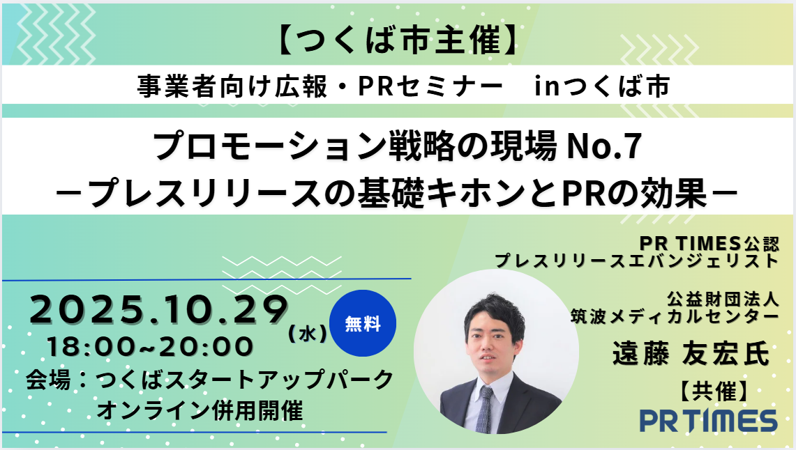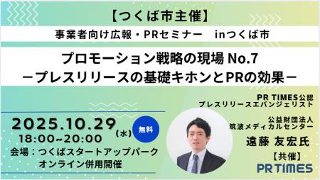 - 開催日:2025年10月29日(水) - 時 間:18:00~20:00- 場 所:つくばスタートアップパーク(先着40名程度)/オンライン(100名まで)- 参加費:無料- 対象:広報、事業担当者、スタートアップの経営者などプレスリリース配信を検討している人、起業を目指す個人など- 主催:つくば市- 共催:株式会社PR TIMES- 詳細、お申込みURL: