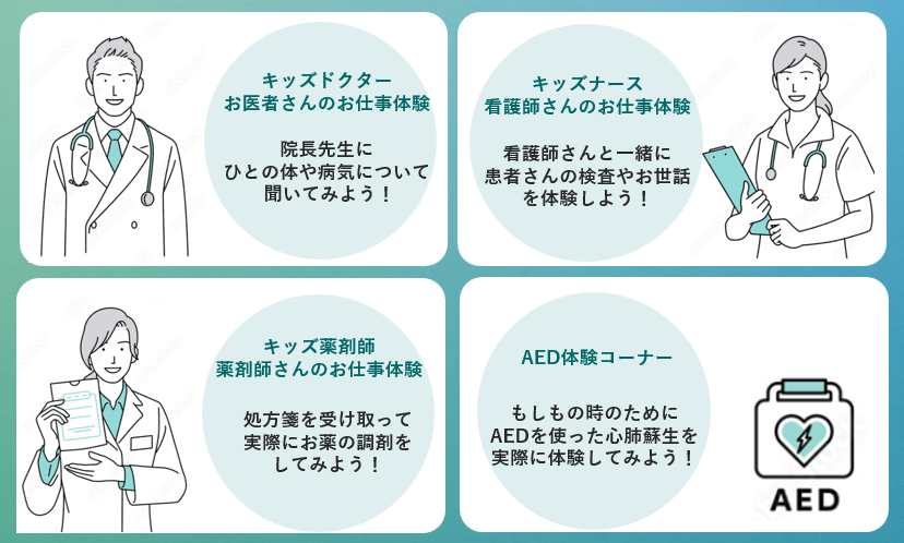 参加した子どもたちからは、「本物のお医者さんみたいだった!」「将来は薬剤師になりたい!」といった感想が寄せられ、保護者の方々からも「貴重な体験をさせていただいた」「子どもが医療に関心を持つきっかけになった」と高い評価をいただきました。