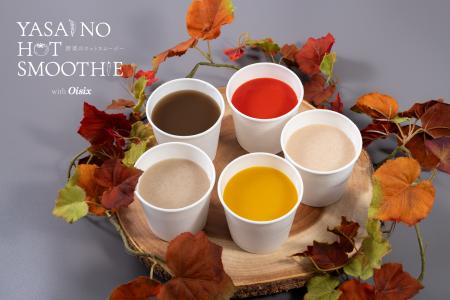 食でココロつなげるセカイをつくる“フードコミュニケーションカンパニー”株式会社ノンピ(本社:東京都千代田区、代表取締役社長:上形 秀一郎 以下ノンピ)は、食品のサブスクリプションサービスを提供するオイシックス・ラ・大地株式会社(本社:東京都品川区、代表取締役社長:高島 宏平、以下 オイシックス)と共同開発した「野菜のホットスムージー」を11月中旬よりリニューアル発売します。日替わりで飽きずに楽しめるうえ、素材の食感や栄養にもこだわった、オフィスでも片手で気軽に取り入れられる健康的なスムージーです。