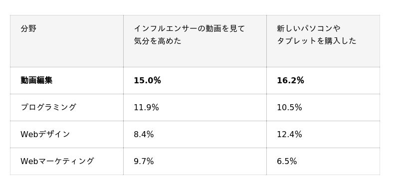 一方で、他のスクール調査と比較すると、「インフルエンサーの動画(YouTube動画など)を見て気分を高めた」(15.0%)、「新しいパソコンやタブレットを購入した」(16.2%)の割合が高いことがわかりました。