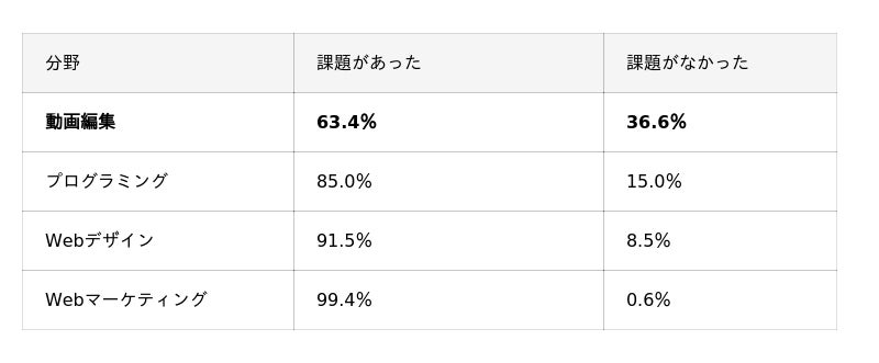カリキュラムにおける課題の有無を尋ねたところ、「あった」と回答した受講生は63.4%と過半数を占めました。他のスクール調査では課題があったと回答した割合が85.0~99.4%と高かったのに対し、動画編集スクールでは大きく下回る結果となりました。
