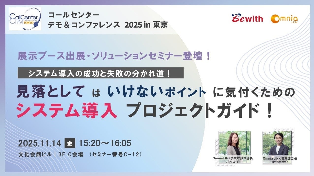 ビーウィズ株式会社(本社:東京都新宿区、代表取締役:飯島 健二)は、2025年11月13日(木)~14日(金)に東京にて開催される「コールセンター/CRM デモ&コンファレンス2025 in 東京」に出展いたします。また、同会場にて開催される「事例&ソリューションセミナー」に登壇いたします。