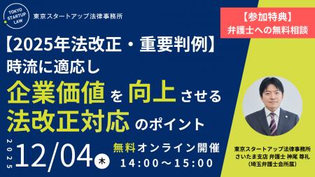 企業法務に取り組む東京スタートアップ法律事務所が、経営者・役員・管理職の方を対象に、「法改正と重要判例への対応」をテーマとしたセミナーを開催。無料・オンライン開催で全国どこからでも参加可能。