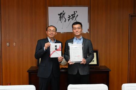 右から)株式会社アイモバイル 田中俊彦代表取締役会長、池田宜永 都城市長