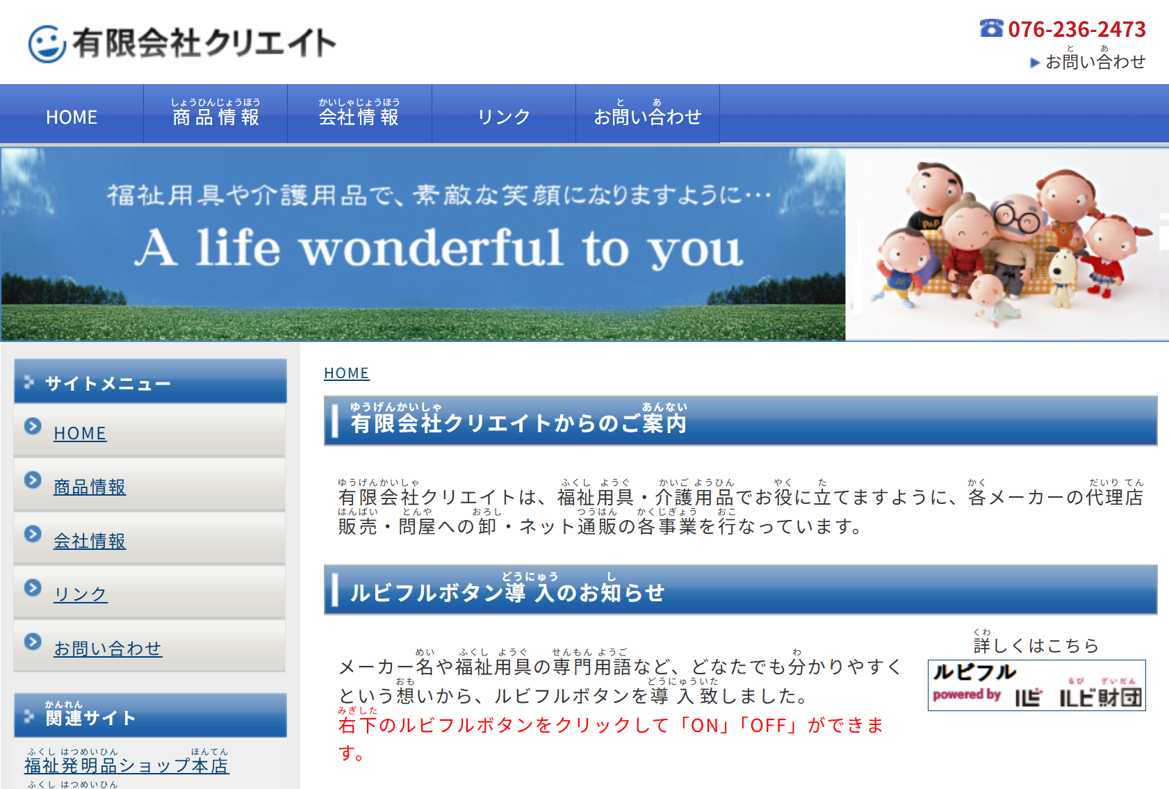 有限会社クリエイトは、福祉用具・介護用品の提供を通じて高齢者や障害者、そのご家族を支援しており、このたび情報をより多くの人にわかりやすく届けるために「ルビフルボタン」を導入されました。閲覧者はホームページ上の「ルビON」ボタンを押すことで、文章に自動的にルビを付与することができます。