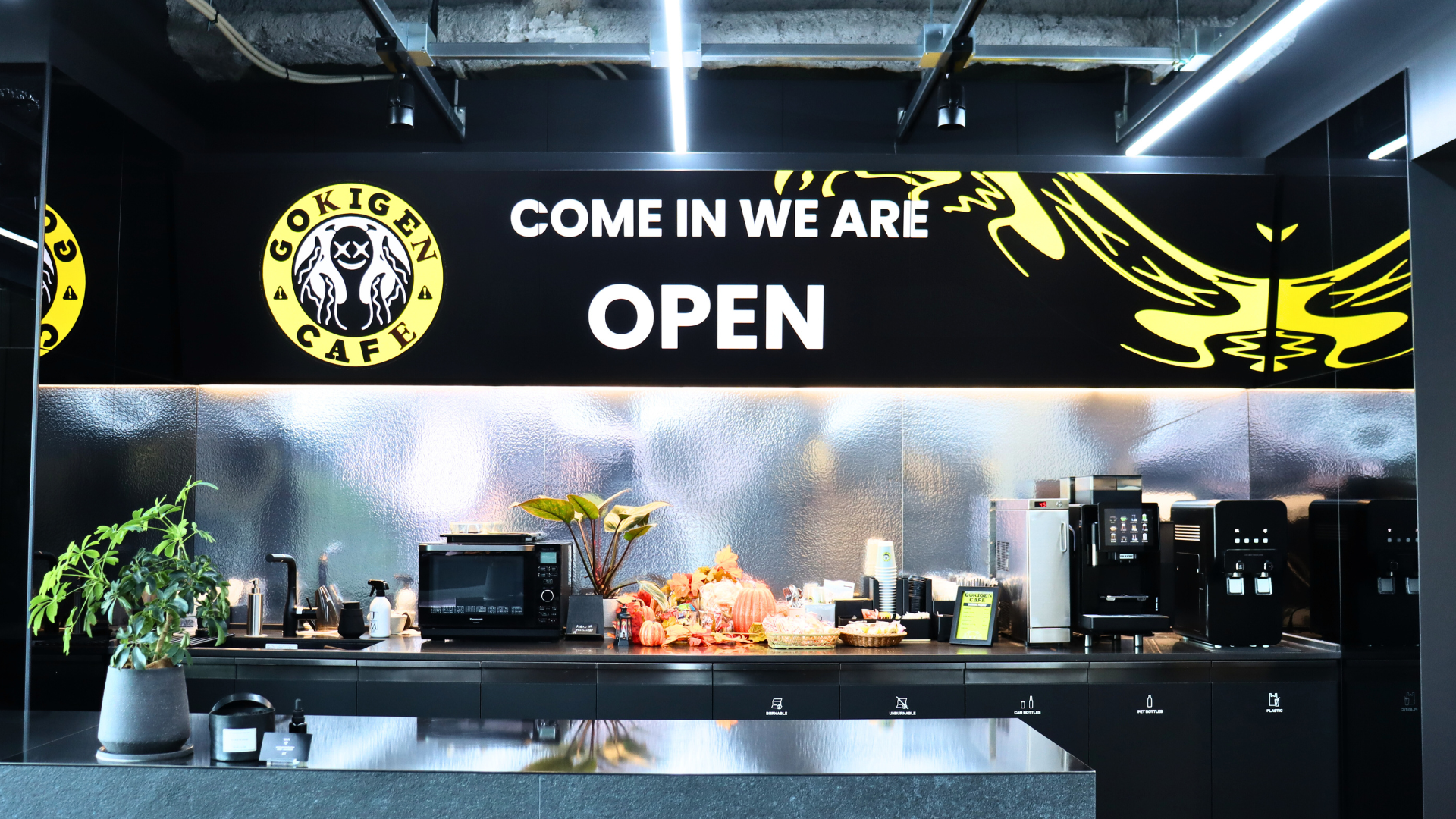 当社が掲げるバリューの一つである「ゴキゲンにいこう。」を体現するため、社員が心地よく働けるオフィス環境を整備。「GOKIGEN CAFE」を併設し、コーヒーや紅茶、お菓子などを無料で楽しめるリフレッシュスペースを設けています。カフェ内のデジタルサイネージでは、社内コミュニケーションの活性化やバリューの浸透を目的とした「感謝メッセージ」や「ゴキゲンエピソード」などを週替わりで放映し、社員同士の自然なコミュニケーションを生み出しています。