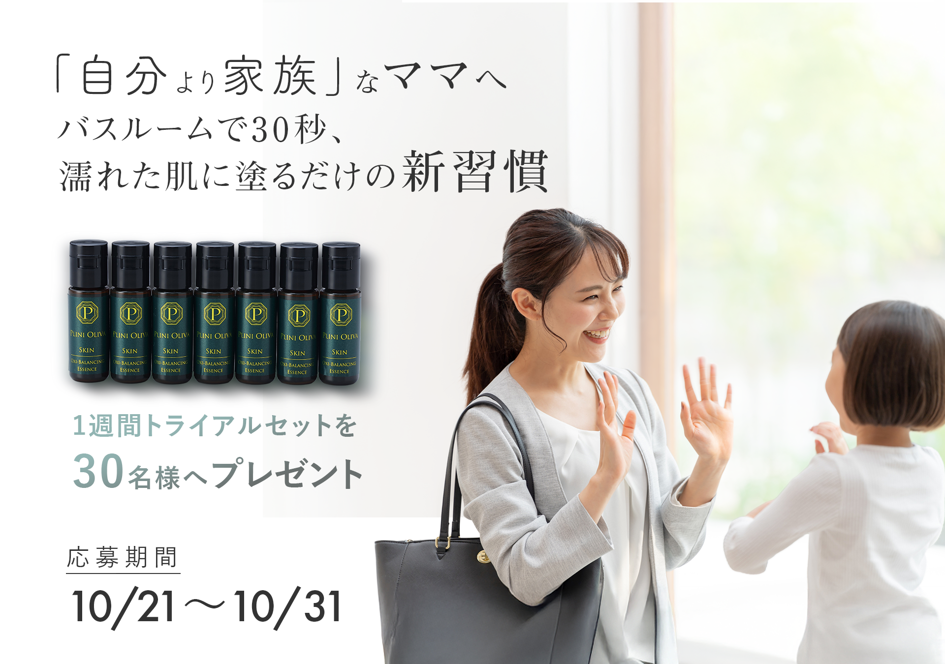 日本オリーブ株式会社(所在地:岡山県瀬戸内市牛窓町、代表取締役社長:服部芳郎)は、濡れた肌にオリーブオイルを塗布することで保湿効果が増大することを研究により明らかにしました。また季節の変化に伴い肌に悩む方が増えてくるこの季節に、仕事や子育ての両立でご自身の肌ケアができずに悩んでいるママの悩みを多く伺いました。そのお声から、研究の成果を実感して頂くため、お風呂あがりの30秒で肌をサポートし、オリーブを科学だけでなく歴史文化から総合研究し誕生したスキンケアブランド「PLINI OLIVA(プリニオリーバ)」を抽選で30名の方にプレゼントします。